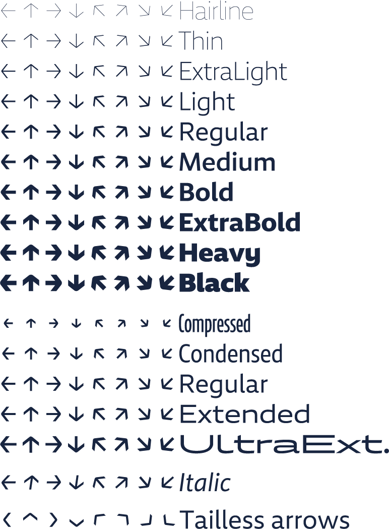 De andre breddene av fonten («Compressed», «Condensed», «Extended» og «Ultra Extended») har ikke kursiv-varianter.