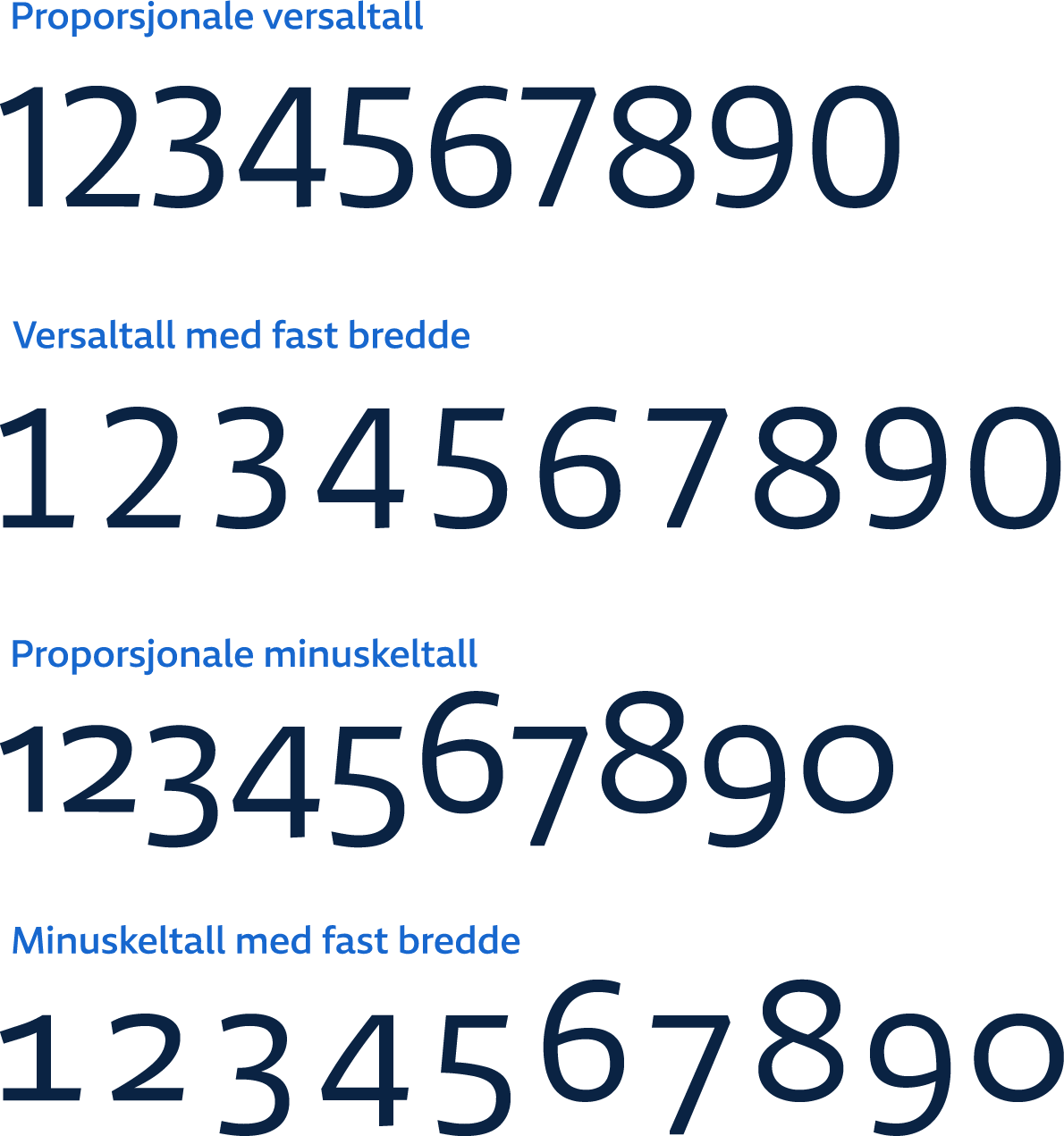Det er 4 varianter av tall: Proporsjonale versaltall, versaltall med fast bredde, proporsjonale minuskeltall, og minuskeltall med fast bredde. På engelsk heter disse: Proportional Lining, Tabular Lining, Proportional Oldstyle, og Tabular Oldstyle.