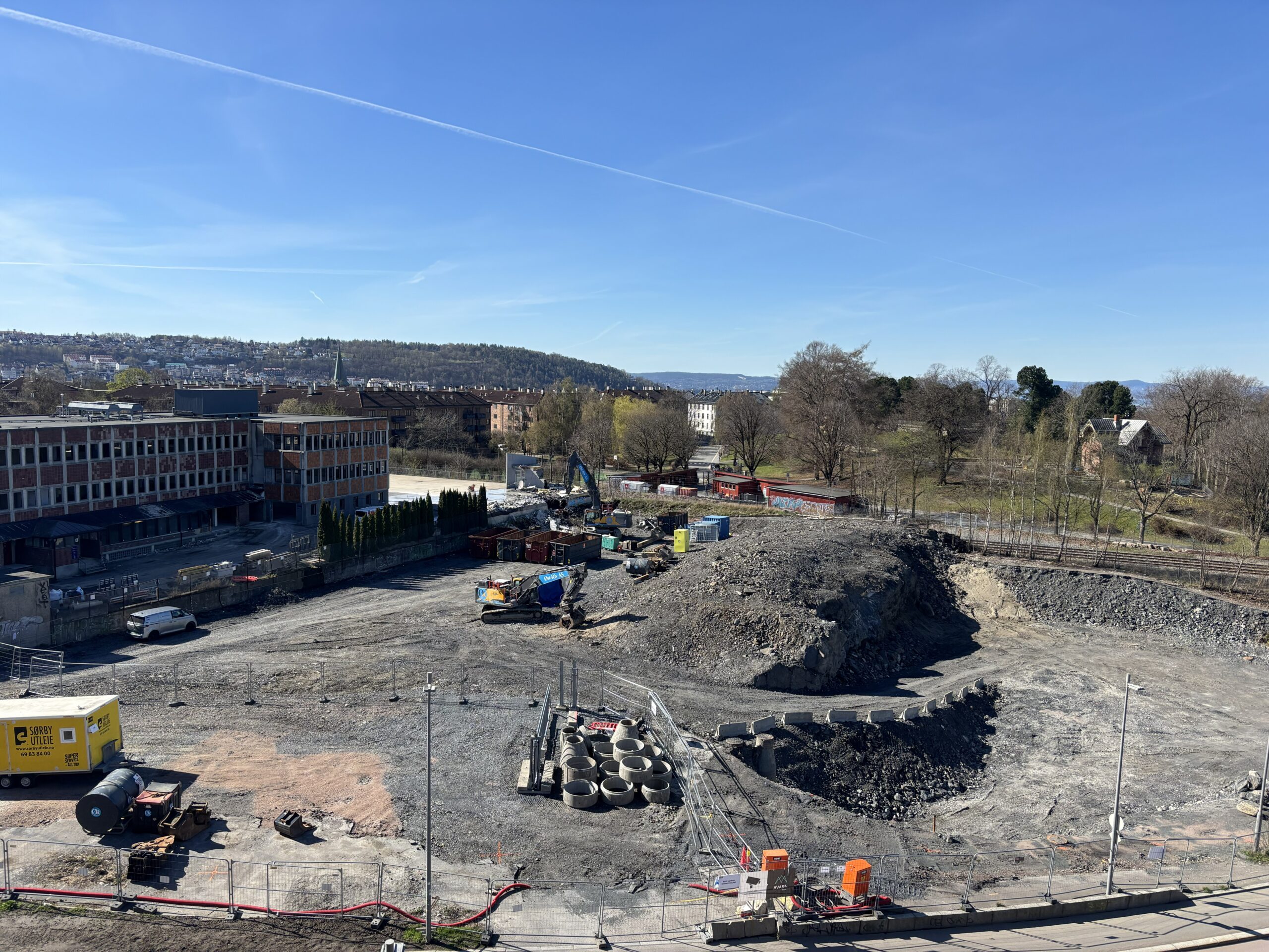 Byggene i Ensjøveien 3 og 5 er revet, mens rivingen av Ensjøveien 7 er i gang. Planen er å ferdigstille rivingsarbeidet før sommeren, slik at grunnarbeidene kan starte i løpet av høsten 2026.