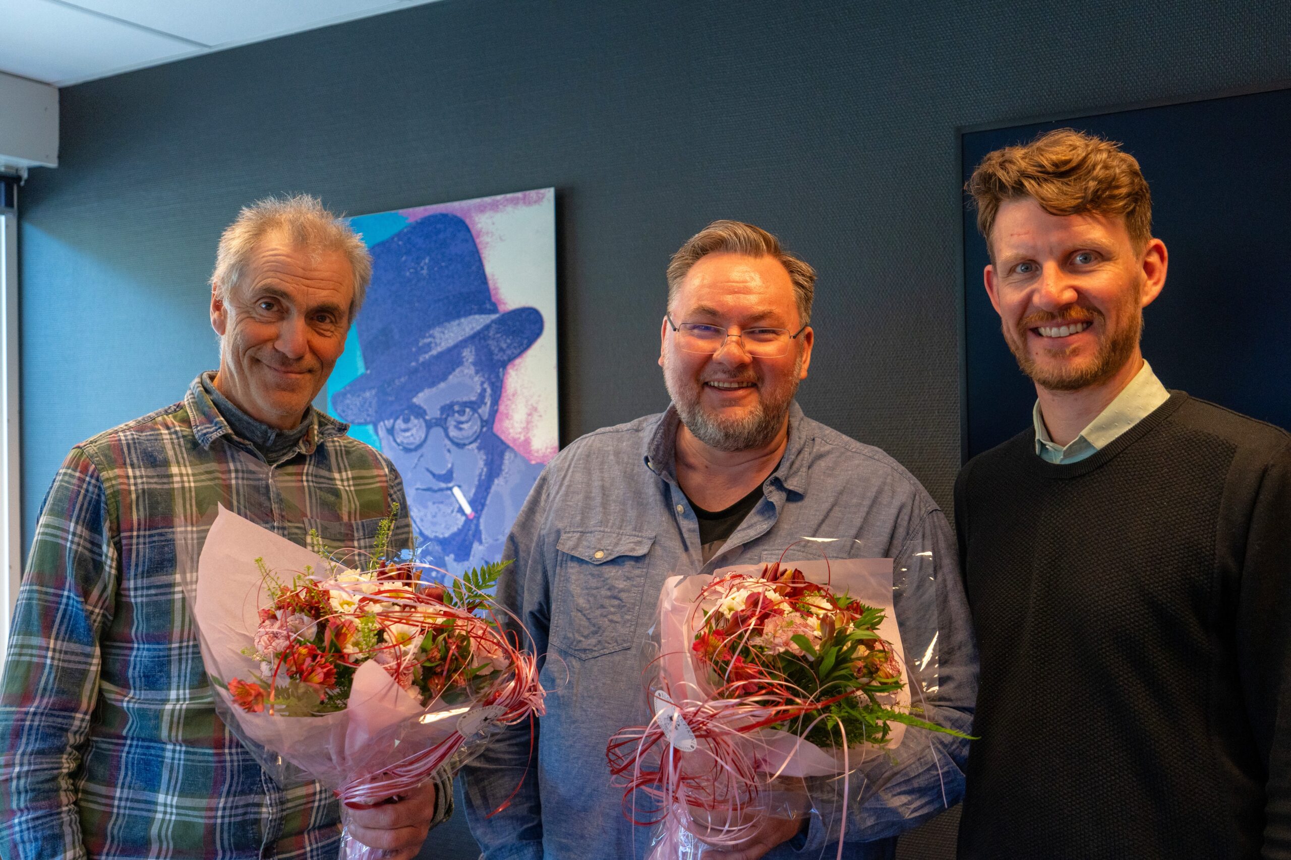 Tor Folgerø (t.v.) og Olav Johannes Bøthun fekk nynorskprisen for journalistar 2025.