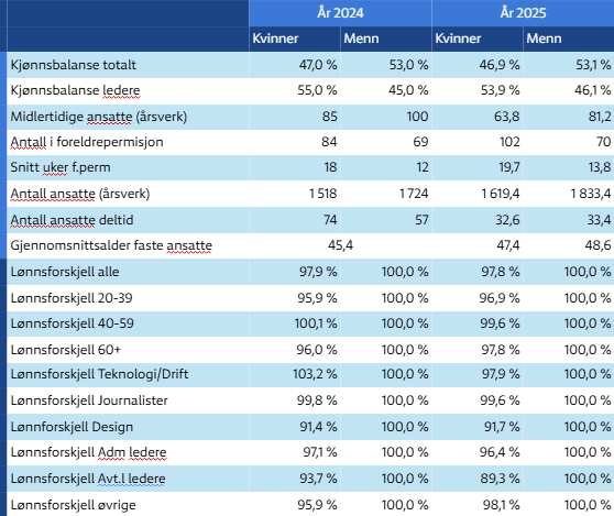 Kjønnsbalansen blant alle NRKs medarbeidere ved utgangen av 2025 var på 46,9 prosent kvinner og 53,1 prosent menn. Blant ledere totalt er 53,9 prosent kvinner og 46,1 prosent menn. Toppledergruppa består ved utgangen av 2025 av åtte menn og to kvinner, der den ene av kvinnene er kringkastingssjef Vibeke Fürst Haugen. Kjønnsbalansen blant medarbeidere som jobber deltid er 54 prosent kvinner og 46 prosent menn. Av midlertidige stillinger, er 63,8 prosent menn, og 46,4 prosent kvinner. i 2025 var 102 kvinner og 70 menn i foreldrepermisjon.